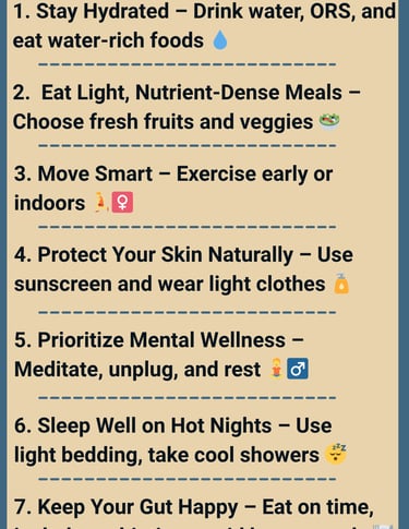 Your body loses more water in the summer, especially through excessive sweating. That means don’t wait until you’re thirsty — keep drinking fluids regularly. Staying hydrated helps your body stay cool, supports your energy, and protects you from heat exhaustion.
